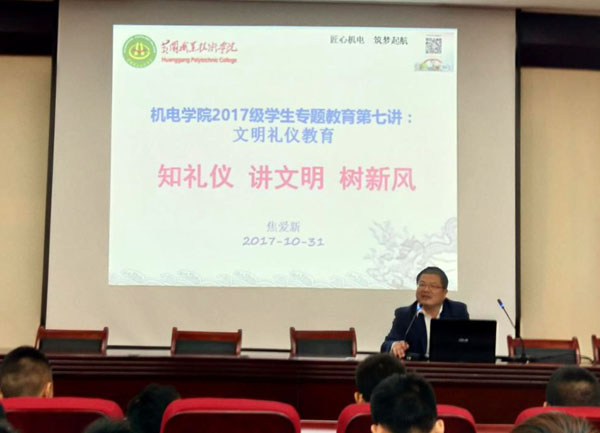 10月31日晚,机电学院在中职园区学术报告厅举办“知礼仪 讲文明 树新风”为主题的文明礼仪教育讲座,由党总支副书记焦爱新主讲,全体辅导员和2017级全体学生参加了活动。