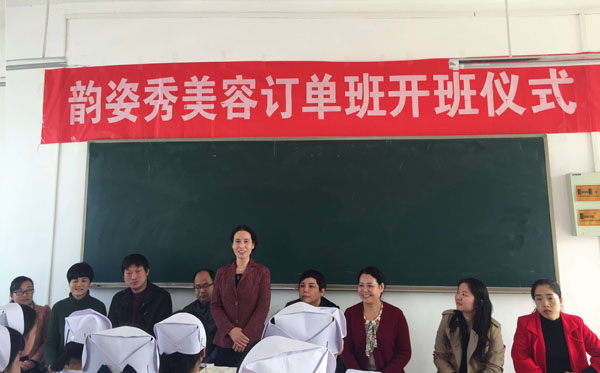 随着人们生活水平的日益提高,人们不再满足基本的温饱问题,更多的转向养生与美容方向,导致医学美容专业人才紧缺,通过市场需求调查及专业调研,我院决定与韵姿秀商贸有限公司联合开办医学美容订单班。2017年11月6日中午12:20,在崇贤阁605教室,护理学院成功举行护理专业美容方向订单班开班仪式,出席仪式的领导嘉宾有:校党委委员胡燕、韵姿秀商贸有限公司总经理谢洁林、教务处副处长曹俊明及护理学院党总支书记王莹华等。开班仪式由王莹华主持。