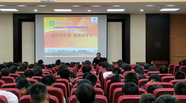 11月6日晚上,机电学院在中职园区学术报告厅举办“扬中华美德 做诚信学生”为主题的诚信教育讲座,由党总支副书记焦爱新主讲,全体辅导员和2017级全体学生参加了活动。