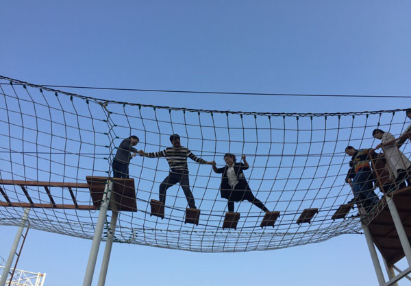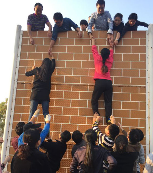 首先进行的是“信任背摔”集体合作项目,“信任背摔”依赖于同事们之间的高度信任和相互配合,然后是“中空体验”、“高空体验”、“毕业墙”等项目。随着活动的深入,老师们的积极性逐渐被调动起来,大家激情四射,踊跃展现自己的青春活力。