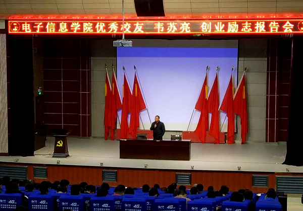 11月23日下午,电子信息学院邀请到了优秀校友韦苏亮为电子信息学院2015级学生作了一次生动的创业励志讲座。党总支副书记程朗、辅导员吴颉老师、余高峰老师、朱子正老师及全体2015级学生聆听了讲座,讲座由朱子正主持。
