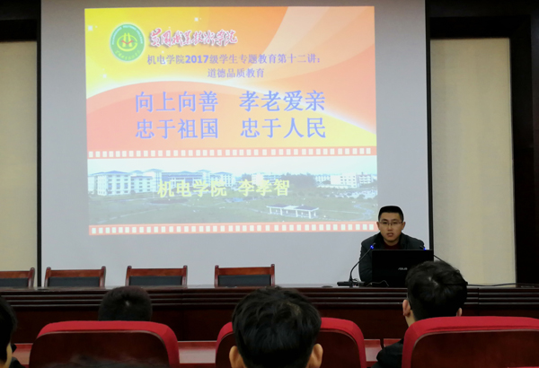 学习十九大精神,机电学院在行动;宣传十九大精神,机电学院全覆盖;贯彻十九大精神,机电学院在延伸。12月5日晚上,机电学院在中职园区学术报告厅举办“向上向善 孝老爱亲”为主题的道德品质教育专题讲座,由团总支副书记李孝智主讲,全体2017级辅导员和学生参加了此次活动。