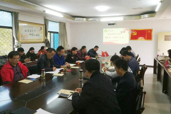 春风拂面精神爽,大地铺锦校园新。3月4日下午,机电学院2018年春季第一次教职工大会在二楼会议室召开,副校长刘东山,学院班子成员、全体教职工参加了大会,大会由党总支书记杨勇主持。