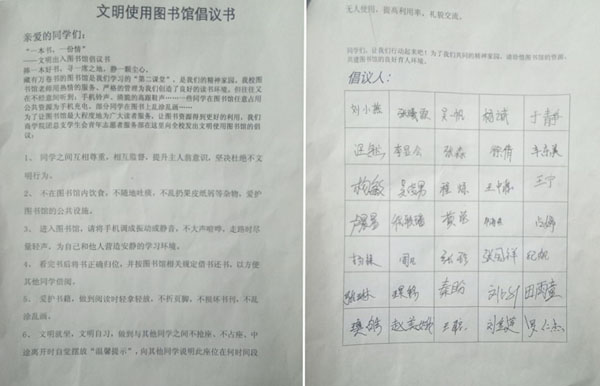 本次活动志愿者们分为5个小组,分别对文科图书馆5个楼层进行卫生清理和图书整理。楼梯间、过道角落等卫生盲区经志愿者们勤劳的双手改造后焕然一新。同时,商学院团总支学生会青年志愿者服务部在这里向大学生发出“争做文明读者”倡议,号召大学生文明借还书,合理运用图书馆资源,提升主人翁意识。