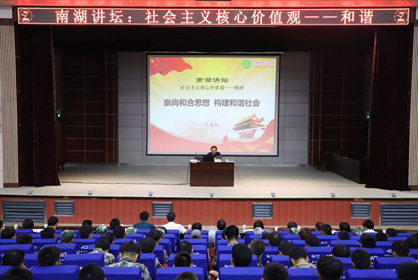 9月13日晚,XK星空在学术报告厅举行南湖讲坛——社会主义核心价值观“和谐篇”专题讲座。讲座由机电学院党总支副书记焦爱新主讲。学校团委书记李宁,学工处副处长汤城,各教学学院党总支副书记、团总支书记、部分辅导员以及600余名学生聆听了报告。学工处副处长、团委副书记崔现强主持报告会。