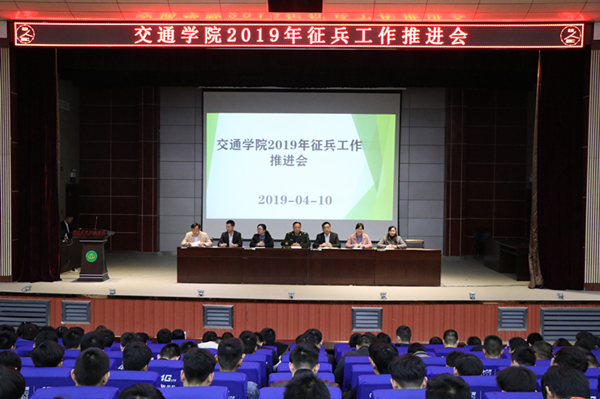4月10日晚,交通学院在学术报告厅召开2019年征兵工作推进会。交通学院党总支副书记黄忠,学工处劳动实践科科长朱卫东,交通学院全体学工人员及600余名学生参会,会议由团总支副书记黄伟主持。