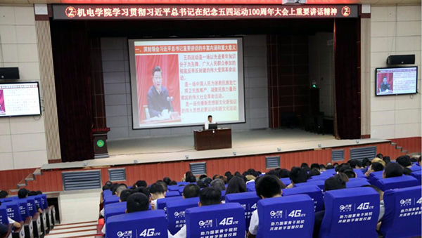 为进一步深刻学习领会习近平总书记在纪念五四运动100周年大会上重要讲话的精神实质和丰富内涵,5月8日晚,机电学院在学术报告厅组织开展了专题学习,活动由党总支书记杨勇主讲。全体辅导员和2017、2018级学生参加了学习。