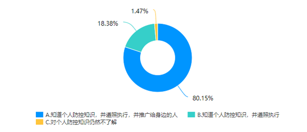 通过调查显示,99.26%的同学学习了个人防控知识后,能遵照执行,其中80.6%的同学表示能推广给身边的人,从而让更多的人了解防控知识并付诸实践。