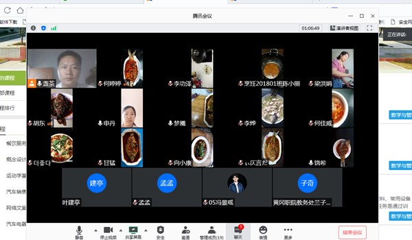 考试时,学生通过同一系统平台签到,监考教师通过腾讯会议,开启摄像头,对考生资格进行严格审查。考试中,视频全程连线。上午《面点工艺与制作技术》考试结束后,月牙蒸饺、生煎锅贴、韭菜盒子等一道道点心呈现在镜头前;下午是《菜肴制作技术》考试,要求学生在家动手制作鱼类菜肴,考试结束后,酸菜鱼、麻辣水煮鱼、红烧武昌鱼、豆瓣鲫鱼等一道道美食出现在镜头前。