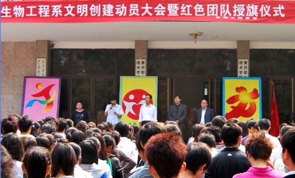 10月21日,生物工程系在启智楼前举行文明创建动员大会暨“红色团队”授旗仪式。系党总支书记余亮彬、院团委副书记陈胜红、系办公室主任郑宝清、系团总支书记李宁、各班辅导员和全系学生参加了本次大会。会议由系党总支副书记程喜荣主持。