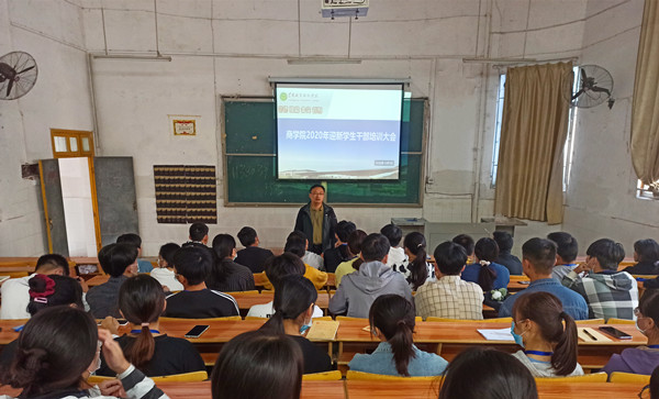 10月9日下午15:50,商学院在群贤阁107教室召开2020年迎新学生干部培训大会。商学院参与迎新的学生干部、社团干部、青年志愿者等共80余人参加了培训。本次培训大会由商学院学工党支部书记、团总支负责人占时杰主讲,商学院党总支副书记刘洋出席了活动。