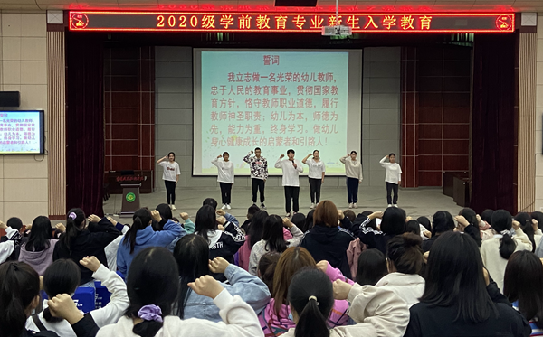 金风送爽开学日,君当怜惜少年时。2020年10月16日,学前教育专业在学术报告厅举行了以“快乐‘童’行,精彩未来,做一个幸福、专业的幼儿教师”为主题的入学教育活动。学前教育专业全体教师和300多名新生参与了本次活动。