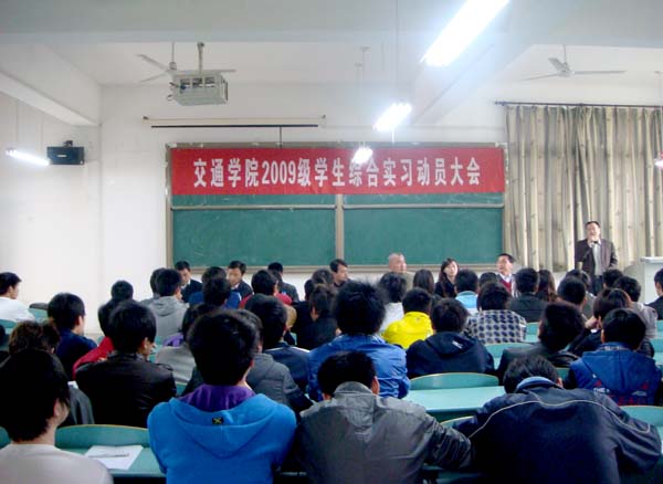 2011年4月1日中午,交通学院在育贤阁104教室举行09级汽修专业学生赴西安比亚迪实习动员大会。院党总支书记钟彬杉,副院长高银桥、办公室主任程朗,比亚迪汽车有限公司人事科杨科长,比亚迪汽车制造厂舒厂长,各班辅导员及全体实习同学参加本次动员大会,大会由院办公室主任程朗主持。