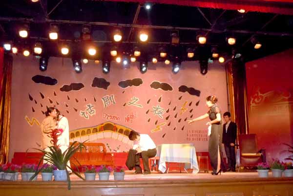 为丰富学生二课活动,提高学生的英语运用和语言表达能力,让学生感受英、应用英语、享受英语,激发学生学习英语的兴趣,商学院商务英语专业于2011年6月1日晚在大学生活动中心隆重举行第八届中英文话剧汇演。观看此次演出的有商学院副书记杨勇、副院长曹俊明、商务英语专业负责人彭晶和全体专业老师及商学院商务英语、国际贸易、市场营销和会计专业的学生。