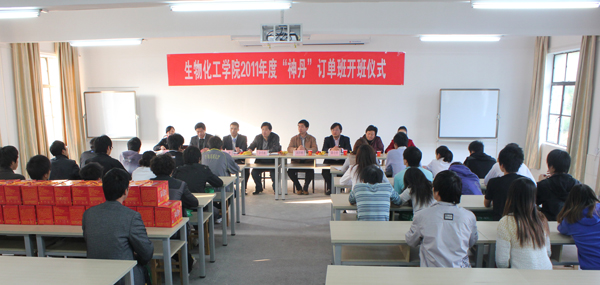 2011年11月26日下午,生物化工学院畜牧兽医专业2011级“神丹订单班”开班仪式在启智楼301室隆重举行,出席此次仪式的领导嘉宾有湖北神丹健康食品有限公司董事长刘华桥,公司人力资源部经理徐鹏,人力资源部的熊琴、吴再艳,生物化工学院党总支书记余亮彬、院长陈全胜、副院长王银林、副书记程喜荣、专业负责人戴益刚,商学院8名市场营销专业同学应邀列席了此次活动,仪式由余亮彬主持。