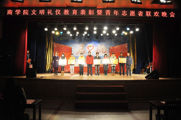 商学院在学工处的指导下,从2011年10月至11月开展了为期两个月的文明礼仪教育主题活动,涌现了一批文明创建的先进集体和先个人。晚会中,首先由女生辅导员万建华老师宣读了此次文明礼仪主题教育活动的表彰决定。吴祝平、陈国清、肖华为先进集体和个人颁发了奖品和奖状。