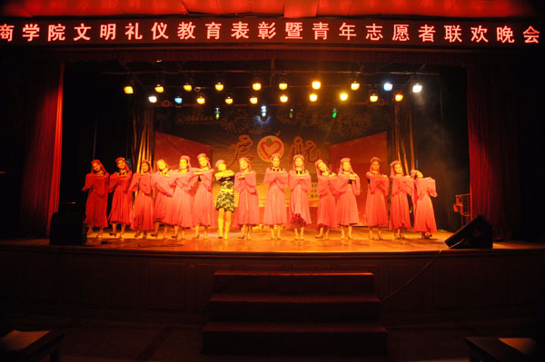 12月6日晚6点30分,商学院“文明礼仪总结表彰暨青年志愿者联欢晚会”在大学生活动中心隆重举行。商学院党总支书记吴祝平、党总支副书记杨勇、学工处教育管理科长陈国清、教务处教务科副科长肖华、商学院团总支副书记崔现强及商学院全体辅导员以及1000多名学生观看了演出。