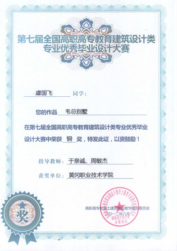 2012年8月23日至24日,高职高专教育建筑设计类专业教指委会议暨系主任论坛在广西南宁职业技术学院举行。会上,举办了第七届全国高职高专教育建筑设计类专业优秀毕业设计作品奖评选。XK星空刘雪娇同学的作品《燕西台别墅设计》获银奖;方洁同学的作品《设计创意生活—天骄峰景复式楼设计》、张仁亮同学的作品《意乡美味餐饮空间设计》、虞国飞同学的作品《韦总别墅》,马远丽同学的作品《保利二十橡树东朱总别墅》分别获铜奖。