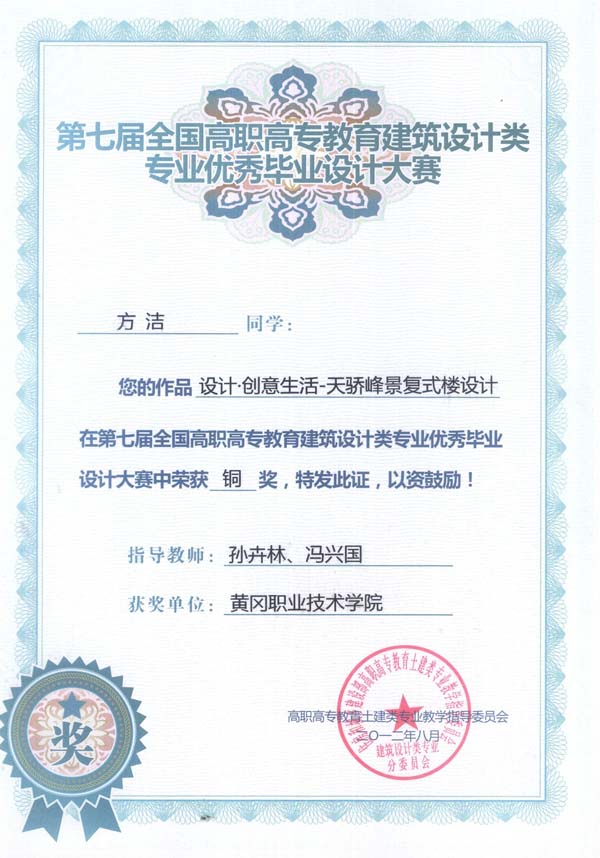 在2012年第七届全国高职高专教育建筑设计类专业优秀毕业设计作品奖比赛中,XK星空建筑学院09级建筑装饰工程技术专业和环境艺术设计专业学生获银奖1项、铜奖4项。