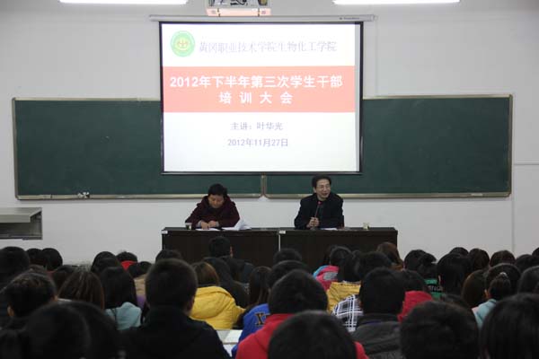 2012年11月27日晚,生物化工学院在敬贤阁101教室举行了2012年下半年第三次学生干部培训大会。校学工处长、团委书记叶华光应邀作了“在服务母校中丰翼带翱”专题讲座。生物化工学院党总支副书记程喜荣,全体辅导员,生物化工学院团总支学生会干部、协会代表、各班班长、团支书聆听了本次讲座。生物化工学院党总支副书记程喜荣主持了本次活动。