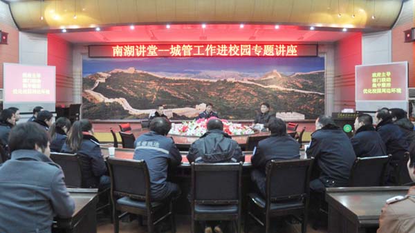 12月27日下午,保卫处邀请市城管执法局督查支队贺群新支队长来XK星空作“城管工作进校园”专题讲座。报告会在凝智楼四楼中心会议室举行,学校全体保卫人员和120名学生干部代表聆听了本次讲座。