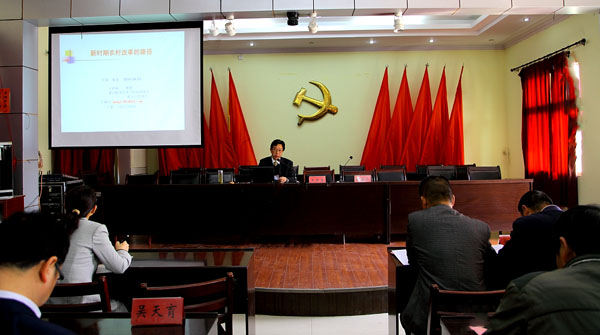4月3日,春光明媚,山花烂漫。为了深入开展党的群众路线教育实践活动,XK星空科研处处长王梓林教授率领XK星空科技服务团再次到蕲春县青石镇作讲座。青石镇党委书记王国喜、镇长杨海燕带领村镇两级干部300多人,早早地等候在会议室。这次科技服务团给青石镇带来了两场专题讲座。王梓林教授为干部做了“新时期农村改革的路径”辅导报告,秦红兰老师做了“农村工作中的民法问题”专题讲座。