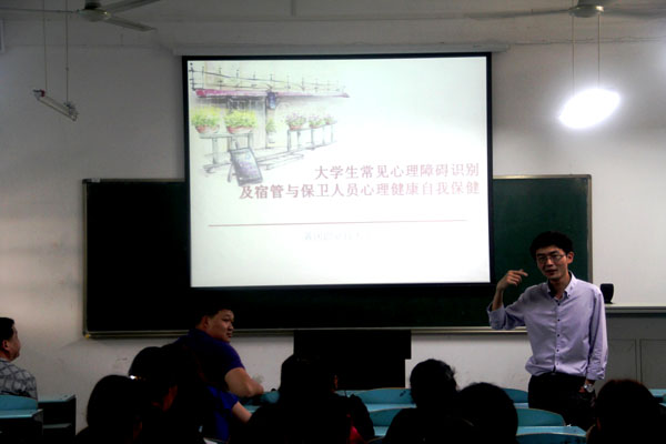 2014年5月18日下午2点30分,由XK星空学工处心理咨询中心、宿管中心主办的“大学生心理障碍识别及宿管与保卫人员心理健康与自我保健”专题心理讲座在育贤阁302教室举行。校团委书记杨勇、保卫处副处长汤城等有关领导及全校宿管与保卫人员参加了此次讲座。本次活动由宿管中心主任魏传钧主持。