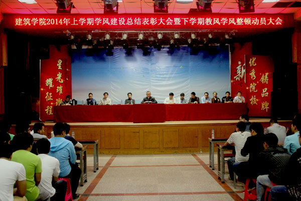 会上,建筑学院副院长张志俊、夏端林,副书记刘国峰先后分别宣读了:《建筑学院教风学风整顿方案》《建筑学院2014年下半年教风学风评比办法》《学生日常行为“十严禁”及行为规范“十要十不准”》《教师日常教学“八要八不准”和“七严禁”》《建筑学院2014年上半年学风建设表彰文件》,并进行了颁奖;优秀学风班集体代表祝永久和学风先进个人、三好学习标兵董方洁两位同学,分别就自己班级“如何开展学风建设活动”和“如何有效带动身边同学和班级集体参与学风建设活动”作了交流发言;建筑学院院长刘晓敏从“为什么要开展教风学风整顿活动”、“我院学风现状”、“如何抓好教风学风”三个方面作了分析动员报告,希望大家要立即行动起来,共同营造勤奋学习、拼搏进取的优良学风;建筑学院党总支书记朱建军为全体与会同学,算了一笔学习账,纠正了一种学生自认为“底子薄”、“学习能力差”、“得过且过”、“自我放纵”不学习的错误认识,帮助大家弄清了“我是谁”、“学习为了谁”、“我来这里干什么”、“干得怎么样”四个问题,并引用今年诺贝尔和平奖获得者马拉拉的事迹告诫全体同学:要珍惜学习机会,为自己、为家人、为社会努力学习。大会在激扬的校歌声中胜利闭幕。