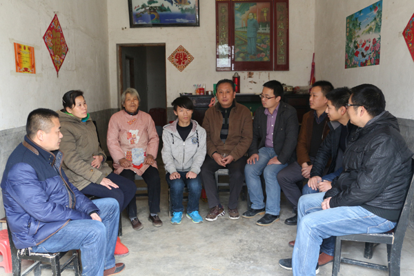 为了深入贯彻党的“三严三实”专题教育活动精神,推进精准扶贫,加大帮扶力度,使国家资助政策这项民生工程惠及家庭经济困难学生,12月5日上午,校学工处处长熊楚舒、校团委书记杨勇、学工处学生教育科副科长吴冬,建筑学院党总支副书记刘国峰、团总支副书记田涛,辅导员林迁、陈继乾、胡丹梅、周宜松一行八人,先是来到浠水县清泉镇三台山村,对钢构201502班的贫困学生吴国双的家庭进行了走访和慰问,给他的家庭送去了学校的关爱和问候。