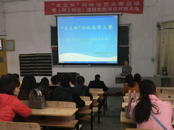 3月17日下午,商学院在群贤阁309教室举行“农夫杯”网络运营大赛与网上创业课程实践项目对接启动仪式。商学院院长袁畅、副院长罗建文、网络营销学院副院长姜艳平、商务系主任刘丽,湖北农夫电子商务有限公司副总经理汪翔、经理叶琼丽,商学院电子商务专业全体教师参加对接仪式。200余名电子商务学生参加了对接仪式。对接仪式由龙慧琳老师主持。