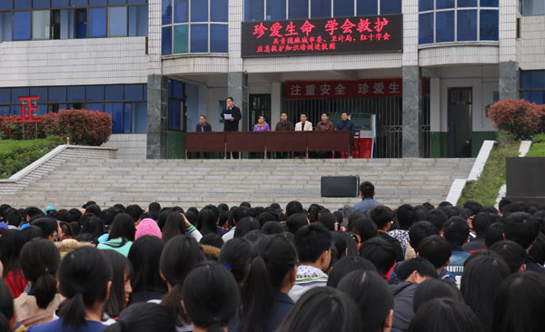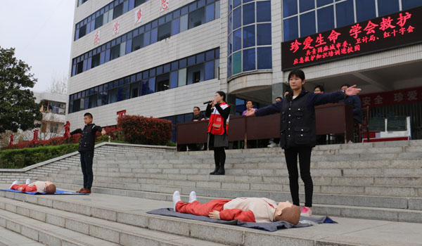 3月29日,在黄冈市红十字会副会长李伦,XK星空医药卫生学院党委书记熊亚芬、党委委员程朝晖同志带领下,医药卫生学院师生一行20余人奔赴麻城市第五中学,在学校的运动场上举行了一场“应急救护”进校园的公益活动。