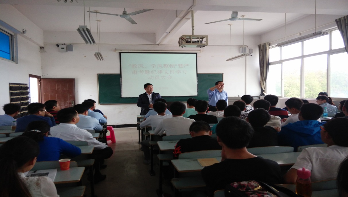 为进一步推进教风、学风建设、强化工作纪律意识,2016年4月14日下午,交通学院在育贤阁410召开了教风、学风整顿暨考勤文件学习动员大会。交通学院党总支副书记黄忠、办公室主任聂进、各专业负责人、实训中心主任、任课教师、辅导员出席了会议,会议由办公室主任聂进主持,在会议的第一阶段2014级、2015级各班学习委员参加了大会。