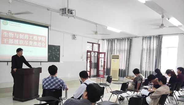 5月24日下午,生物与制药工程学院在敬贤阁201召开了“两学一做”暨干部履职尽责推进会,学院总支班子成员及全体专业主任、实训中心主任、茶叶研究所主任、团总支副书记参加了会议。会上,学院总支书记余亮彬同志围绕“两学一做”学习教育的要求,介绍了总支班子成员的职责和分工,强调了干部履职尽责的重要性和紧迫性。他指出,开展“两学一做”就是为了更好的履职尽责,强化党员干部的责任意识和担当精神,只有履职尽责才能当好合格党员。院长陈全胜指出,党员干部对事业要有敬畏心、感恩心,对工作要讲责任、讲质量,团结、和谐、配合、担当,立足岗位、履职尽责。