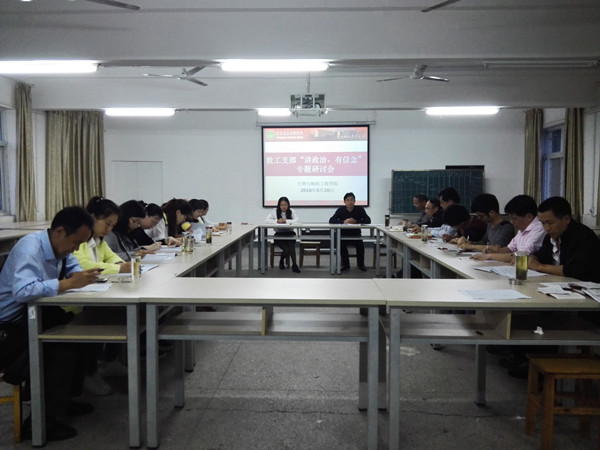 5月26日晚,生物与制药工程学院教工支部、学工支部以支部为单位分别开展了“讲政治、有信念”的专题研讨会,会上,每位党员都认真准备了发言提纲,汇报了前段时间“两学一做”的心得体会,对照“五个着力解决”的问题,查找个人存在的突出问题,并结合当前工作,提出了个人整改落实措施和努力方向。