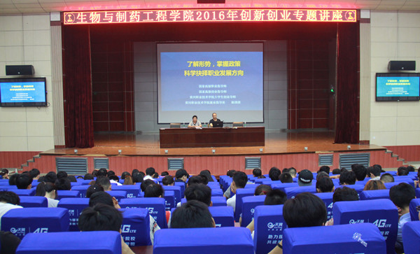 2016年6月16日19:00,生物与制药工程学院2016年创新创业专题讲座在学术报告厅举行。本次创业讲座由学校就业处陈国清科长主讲,生物与制药工程学院党总支副书记程喜荣主持,学院全体在校学生聆听了讲座。