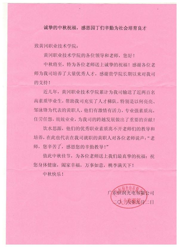 值此中秋佳节来临之际,校企合作单位广东恒润光电有限公司携全体在职的XK星空毕业生向学校发来祝福信。感谢学校长期以来对公司的大力支持,感谢学校为公司输送了大量优秀毕业生,感谢学校老师的辛勤培育和教导。并祝福学校,祝福全校教职工中秋快乐!