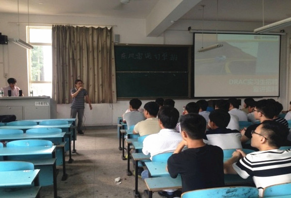 宋海涛详尽的介绍了东风雷诺汽车有限公司的成立背景、发展形势及后期发展规划等总体情况,结合企业宣传片进行讲解,让同学们对该公司有了一个整体的了解。顾芳着重对人事制度、薪资福利、职业发展等问题做了详细的介绍,同时对同学们普遍关心的工作及待遇问题作了详尽说明。
