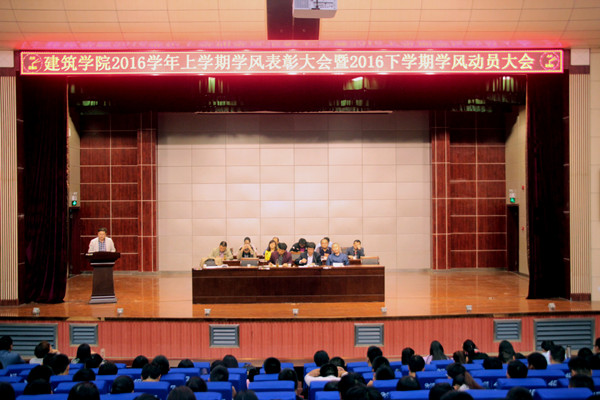 为进一步推进教风、学风建设,2016年10月13日晚上,建筑学院在学校学术报告厅召开了2015-2016学年第二学期学风建设总结表彰暨2016-2017学年第一学期教风、学风建设动员大会。建筑学院党总支书记刘晓敏、院长黄正东、副院长夏端林、副院长张志俊、各专业负责人、实训中心主任、全体教师、辅导员及教务员等出席了会议,会议由院长黄正东主持,2015级部分学生、2016级全体学生参加了大会。