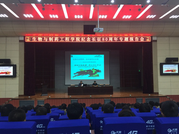 为纪念长征胜利80周年,重温伟大的长征精神,回顾党的奋斗历史,继承和发扬党的革命理想信念,在喜迎党的十八届六中全会之际,10月27日晚,生物与制药工程学院在学术报告厅举办了“纪念长征胜利80周年暨学习党的十八届六中全会精神”报告会,特邀思政课部张宏书副教授为全体在校师生作了题为《弘扬长征精神,走好新的长征路》的主题报告。生物与制药工程学院党总支副书记程喜荣出席并主持。