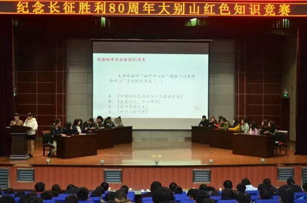 为了纪念伟大的长征精神和民族精神,进一步弘扬红色传统,传承红色基因,发扬我党我军的光荣传统和优良作风,进一步坚定广大党员干部的理想信念,激发广大学生的爱党爱国热情,11月24日晚纪念红军长征胜利80周年大别山红色知识竞赛决赛在学术报告厅隆重举行。本次大赛由大学生思想政治理论研究协会承办,在校团委、学工处和思政课部的大力支持下,知识竞赛取得圆满成功。协会指导老师尹田生、各协会代表和学生代表共600余人观看了本次比赛。