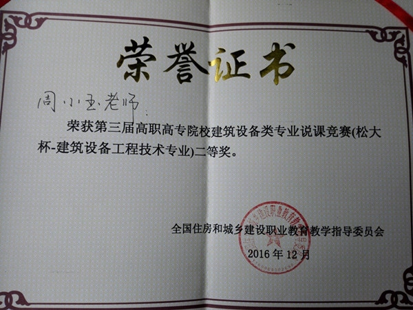 2016 年12 月5-6 日,XK星空青年教师周小玉、艾湘军参加了在浙江温州举办的第三届高职高专院校建筑备类专业说专业说课竞赛。此次比赛旨在加强建筑设备类专业内涵建设,拓展专业课程开发创新的思路,为专业教师提供学习、交流、锻炼的平台,全面提升专业带头人、骨干教师的教学研究水平和教学实践能力,因此吸引了全国建筑设备工程技术专业的优秀教师参加。经过激烈的角逐,周小玉获得说课比赛二等奖,艾湘军获得说专业比赛优秀奖。