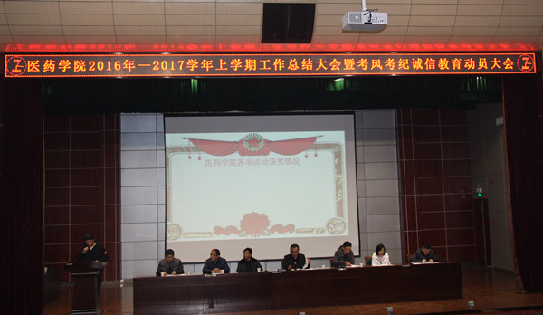 12月22日晚上6:00,学术报告厅座无虚席。医药学院召开2016年-2017学年上学期学生工作总结暨考风考纪诚信教育动员大会。学院班子成员、专兼职辅导员、受表彰班级学生及各班班干部、学生代表参加了会议。会议分两个阶段进行,由欧阳风雷主持。