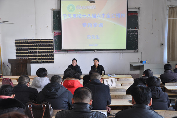 12月29日下午,商学院在群贤阁309举行了一场以“学习贯彻十八届六中全会精神”为主题的专题党课。专题党课由学校党委委员、副校长段院生主讲,商学院院长周常青主持。商学院全体教职工聆听了党课。