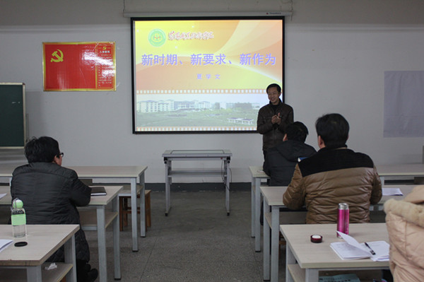 夏学文从“新时期、新要求、新作为”三个方面进行分析,他指出:在发展新时期,高职步入重新发展、重新洗牌、重新排位新阶段,全体教职工应该不懈怠、不放弃,不抱怨。通过高职教育热词解读,夏学文解读了国家政策,指出《高等职业教育创新发展行动计划(2015-2018年)》是今后一个时期高等职业教育战线贯彻2014年全国职业教育工作会议精神,深入推进改革发展的路线图;其中明确的任务和项目是高等职业教育改革发展的工作载体。并针对生物与制药工程学院的发展特点,指出了在创新发展行动计划中的主要任务与举措。最后,从“一个强化、四层推进、三大步骤、一个载体”指出在高职发展新时期,国家提出的新要求下,我们应该有新的作为。