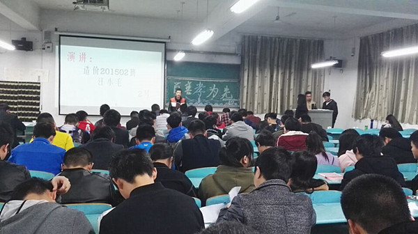 3月24日—29日,建筑学院各团支部开展 “孝道文化”主题团日活动,各班辅导员通过现场聆听校党委委员、工会主席、宣传部长郑柏松的孝道文化专题讲座,认真学习讲座课件,利用晚自习在班级开展专题学习。通过学习,形成了浓厚的弘扬和践行孝道文化的校园氛围。3月30晚,建筑学院团总支在育贤阁104教室举办“百善孝为先”演讲比赛,各参赛选手从弟子规、父母十深恩、眼中父母的孝行、如何及时行孝等方面进行演讲,让在场观众对孝心、孝行有了更加深刻的认识和体会,使同学们深受感动和启发。4月2日—4日,建筑学院广大师生利用清明节放假期间,通过回乡祭祖、扫墓祭拜表达对逝去亲人的怀念和对亲情的尊重,真正让孝道文化入脑、入心、入行。