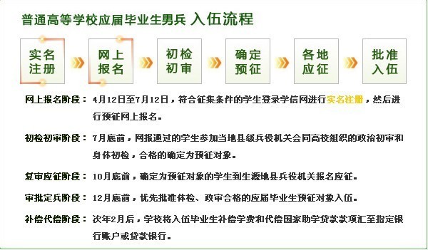 2011届应届毕业生预征报名图示 来源: 作者: 发布时间:2016-02-27 09:31:13 浏览次数: 次 【字体:小 大】 一、预征报名网址: 二、男兵征集对象要求: 三、应届毕业生入伍优惠政策: 四、应届毕业生入伍流程 分享到: 【打印正文】