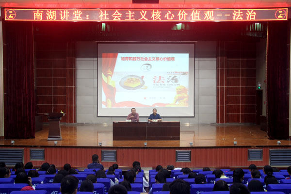 汤城从“怎样理解法治”“如何弘扬和践行法治”“大学生如何践行社会主义核心价值观中的法治”三个方面,对“法治”进行了深入浅出的解读。同时列举大量的事实案例,教育广大同学敬畏法治、信仰法治、践行法治、勤于学法、善于用法、勇于护法,在日后的学习生活和工作中要遵循办事依法、遇事找法、解决问题用法、化解矛盾靠法、主动纠正违法的原则,做到章法有度,自成方圆。报告会上,汤城用通俗的语言、大量的实例和亲身的实践经验,深刻阐述了我国法治的发展历程、现实展开以及未来展望,让与会人员深受启迪。