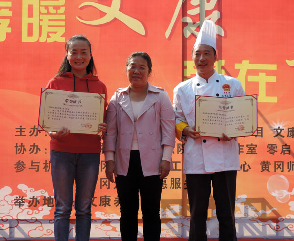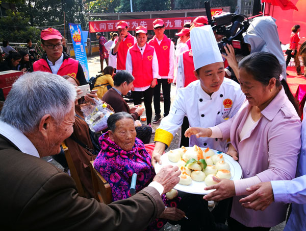 XK星空张彬技能大师工作室、烹饪协会、护理协会、康复协会、武术协会共40余名志愿者,利用所学专业技能,为老人推拿按摩、测量血压血糖,宣传老年保健知识,还表演了武术、黄梅戏等节目;张彬技能大师工作室的张彬副教授表演了川剧变脸绝活,并与学生现场制作了美味可口的东坡酥、东坡肉、黄州手工鱼丸、寿桃面点,让老人们啧啧称赞。