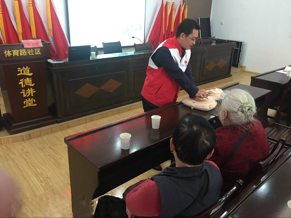 课堂上,红十字志愿者生动、细致地为居民们讲解了救护新概念和日常常见的急救、自救、互救的基础知识、方法,以及急救过程中的注意事项,并分别就心肺复苏术、人工呼吸法、成人和气道梗阻急救、创伤救护等紧急救护技能方面进行了讲解和示范,尤其对“黄金四分钟”如何采取有效的应急措施做了详细的示范和演练。