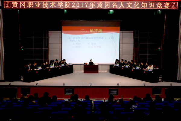黄冈有着光荣的革命传统和丰富的人文资源,名人荟萃,群星灿烂。为深入挖掘黄冈名人资源和传承名人文化,培育学生立志立行的责任担当,12月26日晚,由学工处、校团委主办,医药学院团总支承办的2017年黄冈名人文化知识竞赛决赛在学术报告厅隆重举行。校党委委员、工会主席、宣传部长郑柏松,医药学院党总支书记陶志勇,学工处处长熊楚舒,校团委书记李宁,各教学学院团总支书记、辅导员老师以及600多名学生代表一同观看了比赛。